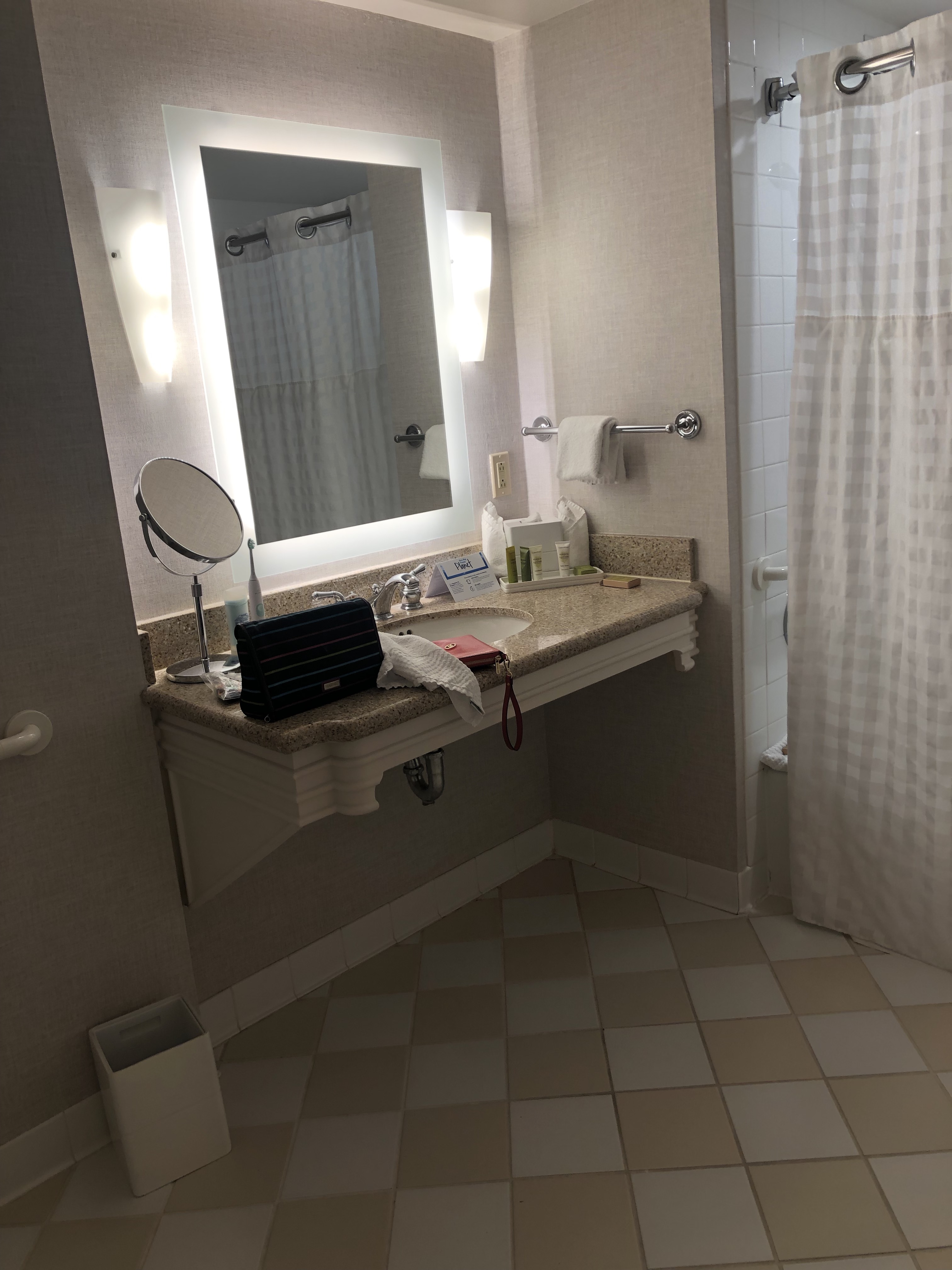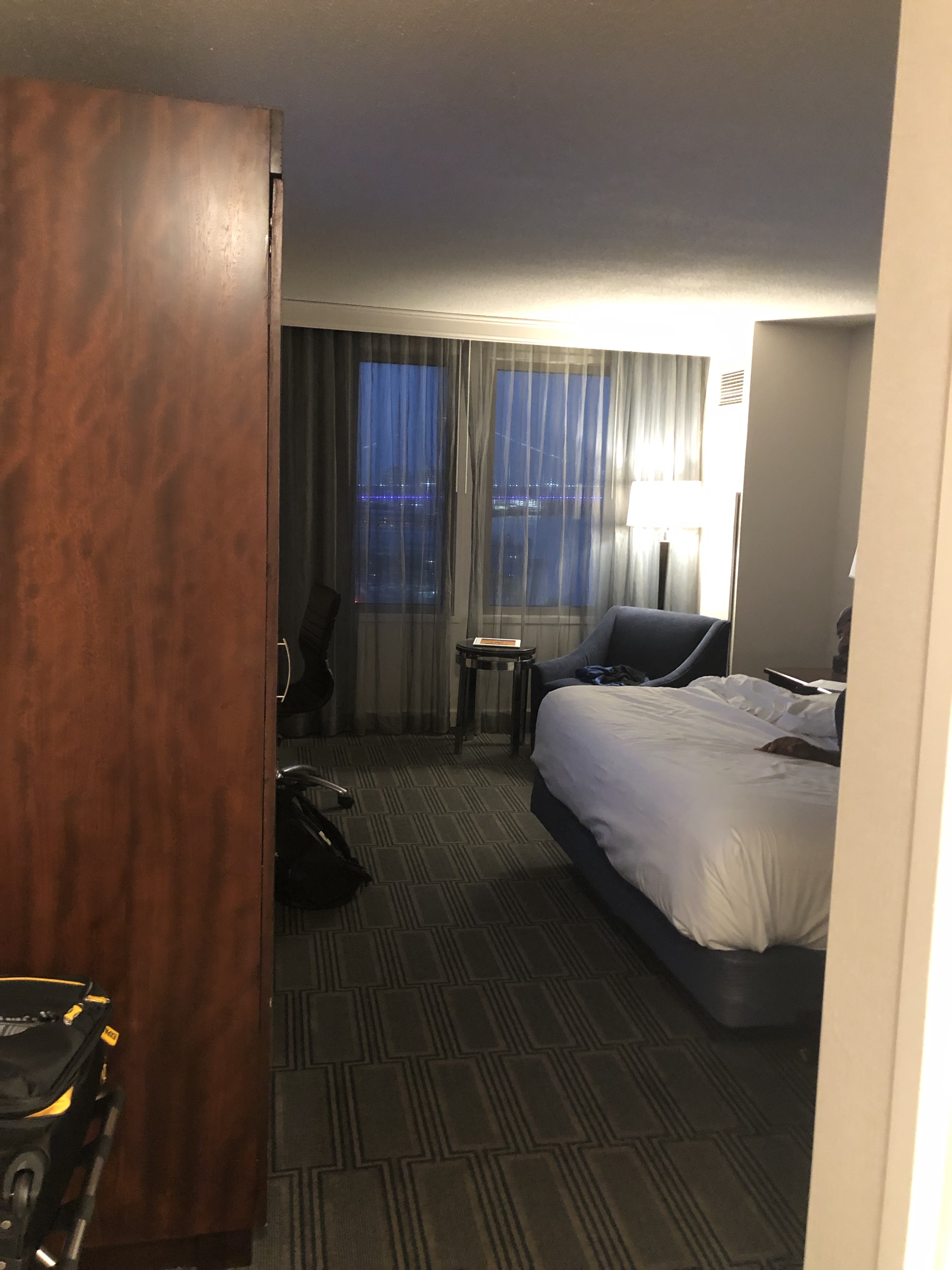 • The Room: Was interesting –on the 18thfloor, our room had a view of both the river and Seaport Museum. The aesthetic of the room was nice; however, we did have a few issues. The bed sat on a metal frame that was not bolted to the floor and to say it was noisy would be an understatement. Simply getting off and on the bed caused it to creak a lot. Our other issue was the bathroom. The shower head did not all work, half of it just dumped water and the other didn’t put out any water in general.