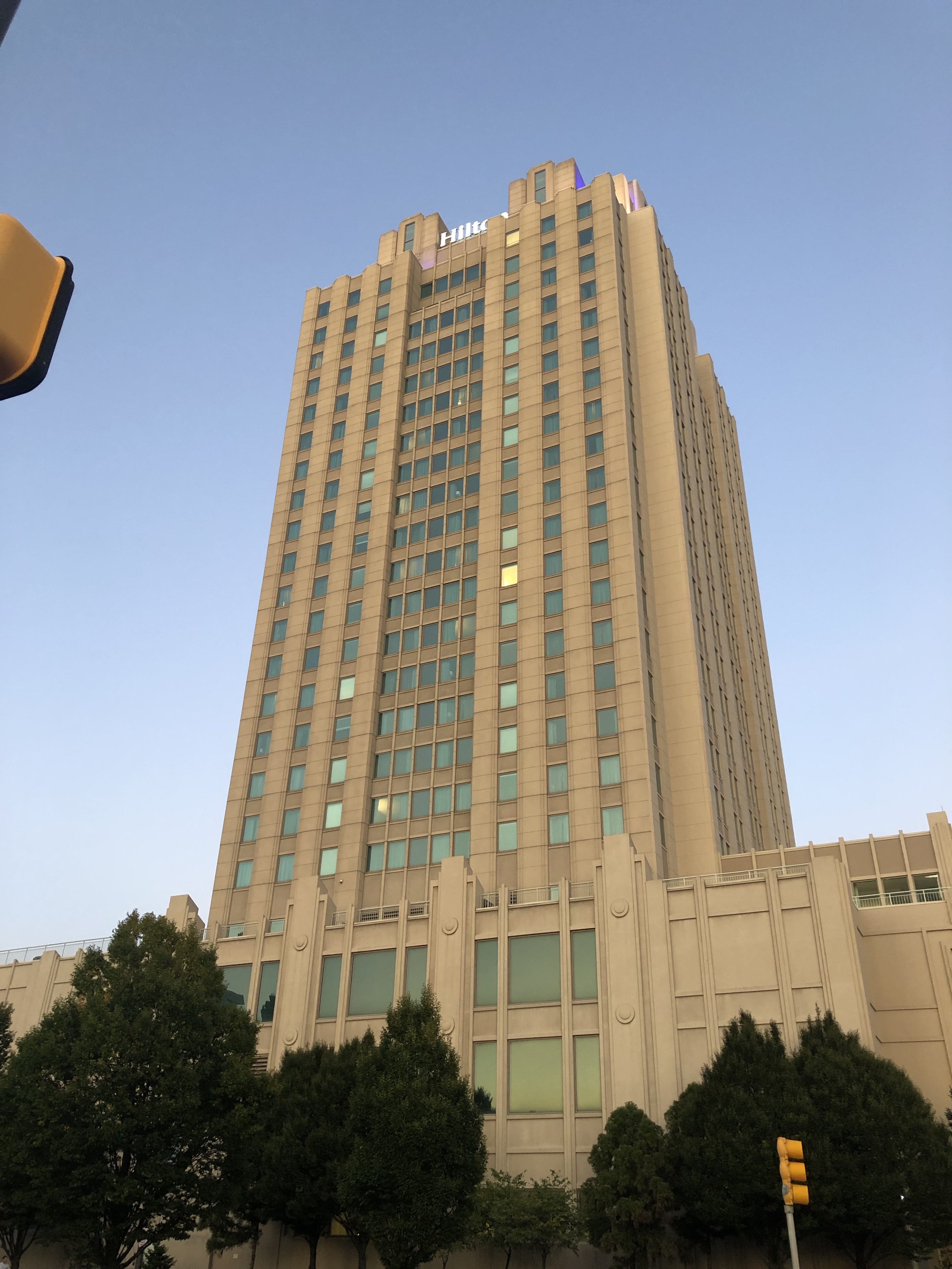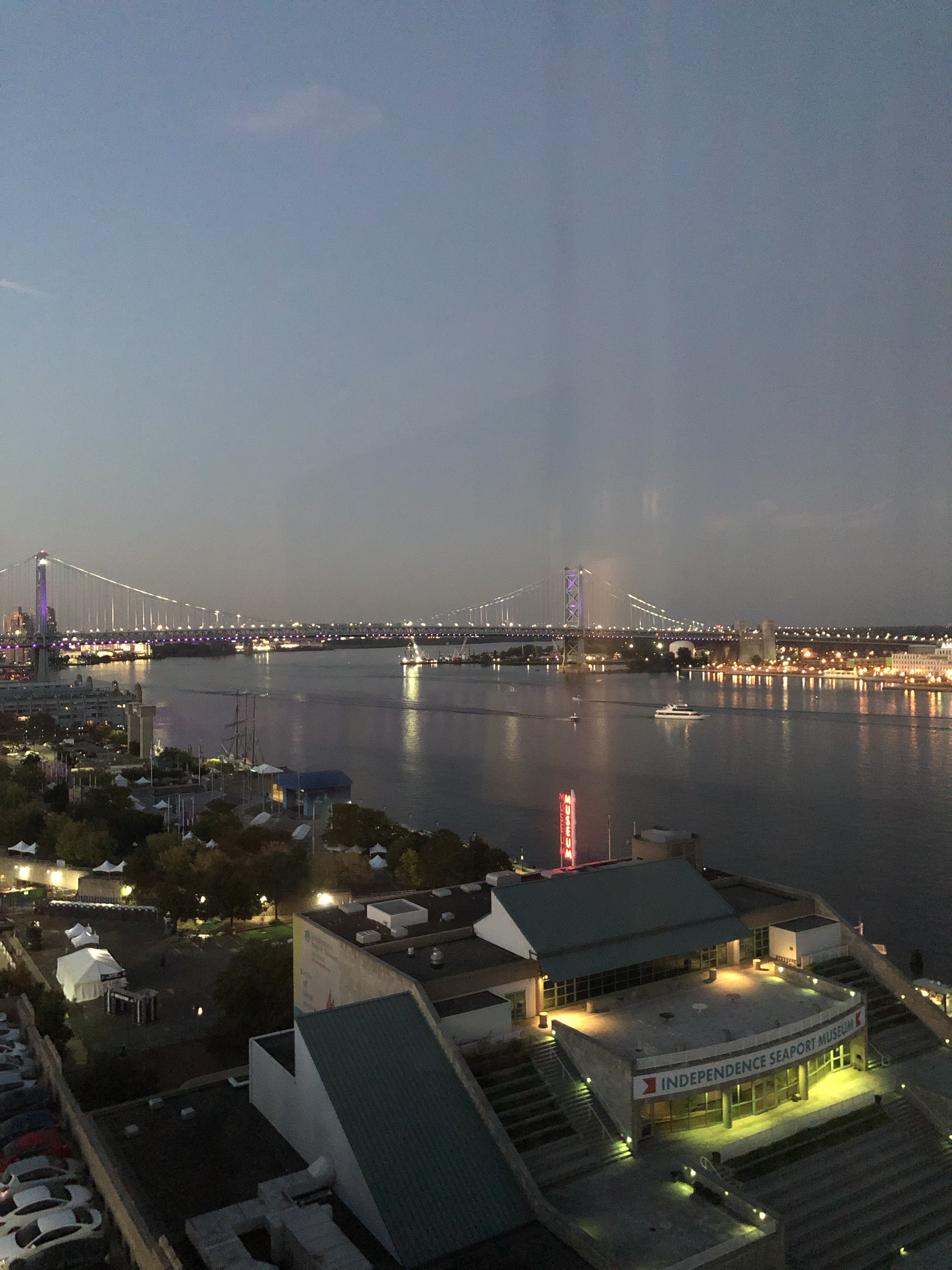 Right on the Delaware River in Penn’s Landing. It has a restaurant on site, pool, gym, and full conference center.